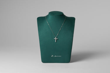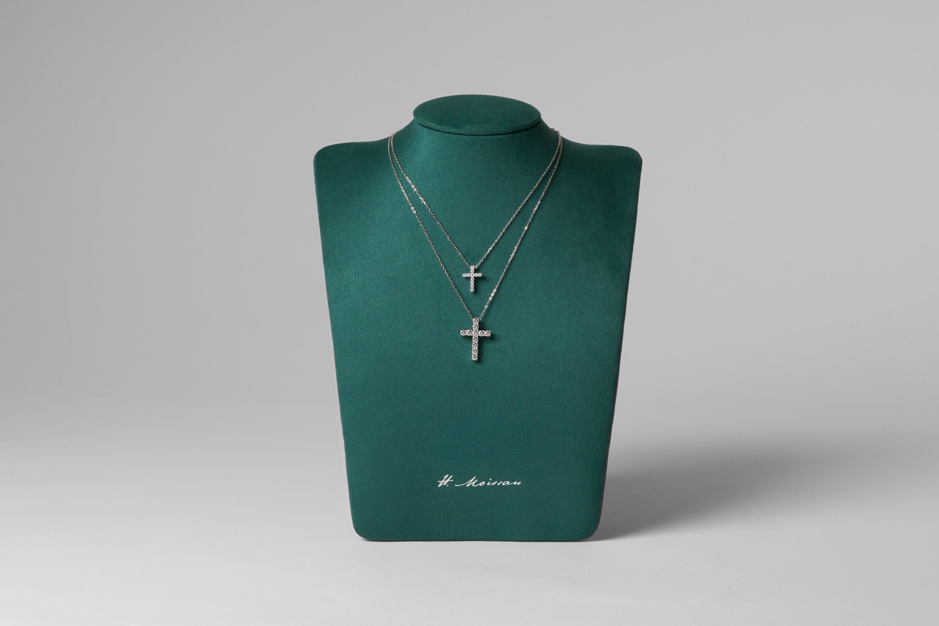 H. Moissan sets the standard of tradition and elegance; the H. Moissan cross is no exception. Composed of 2.5 mm Moissanite stones that hang on a delicate chain, this piece is made of S925 sterling silver and plated with 24k gold. The H. Moissan cross identifies its uniqueness with the distinguished single emerald from our house set in the back of this astonishing piece.