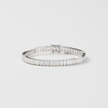 This bracelet features a continuous line of baguette-cut moissanites that shimmer with architectural brilliance, offering a radiant expression of purity and understated luxury.