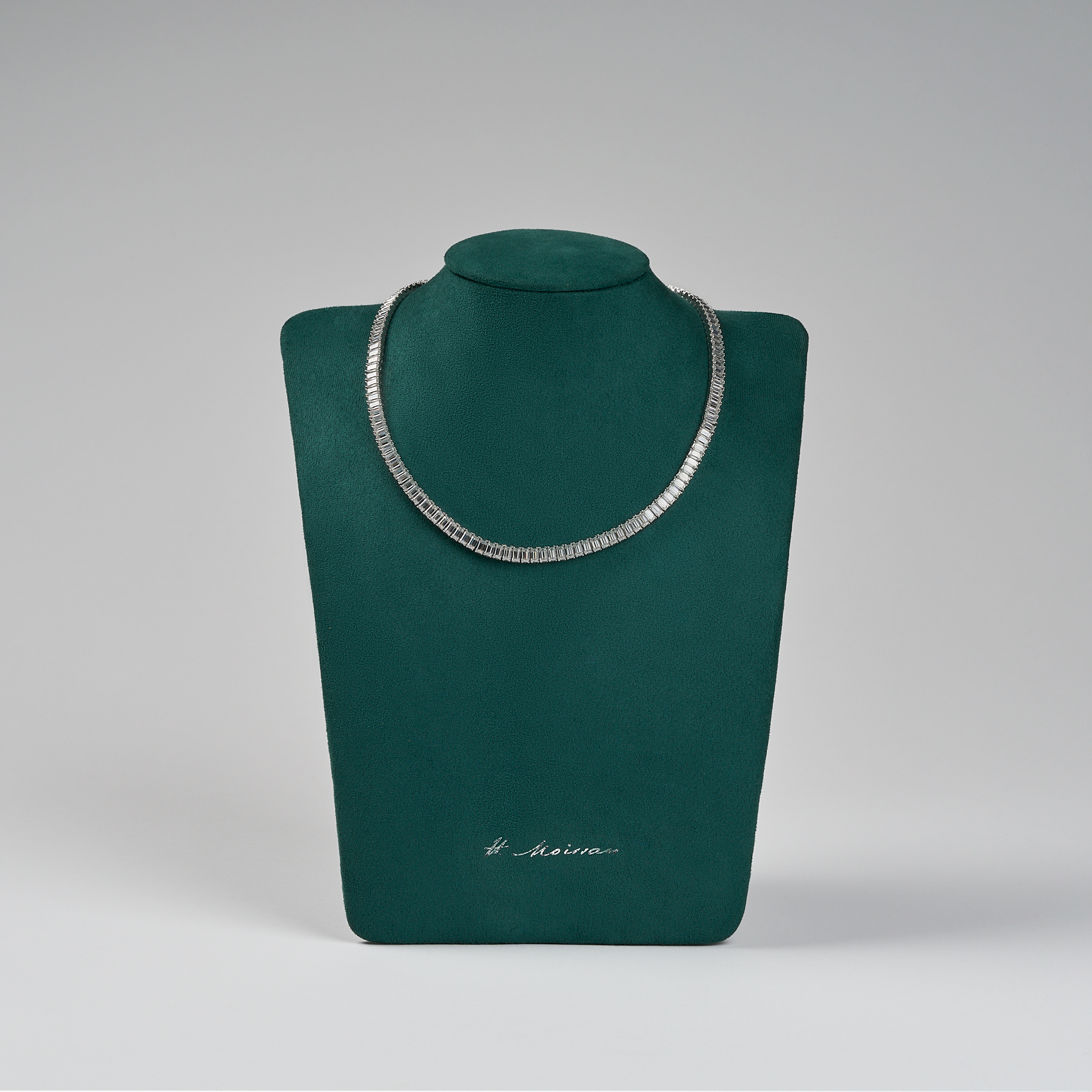 The Baguette Tennis Necklace is composed of meticulously cut moissanites that trace the neckline with continuous brilliance. Each stone reflects a harmony of light and proportion — a piece that embodies quiet strength and contemporary elegance.